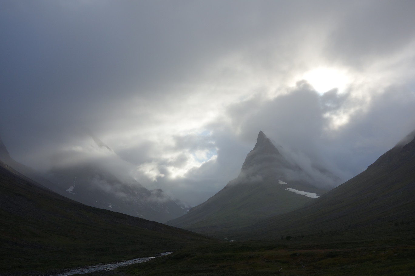 Ich hatte mir im Vorfeld etwas Sorgen wegen den berühmt-berüchtigten Mücken in Nordschweden gemacht und war deshalb sehr froh festzustellen, dass es fast gar keine Gelsen gab. Schnell war aber auch klar, was der Grund dafür war: Es war einfach schon zu kalt. Unsere Internetrecherchen hatten zwar ergeben, dass wir durchaus mit kaltem Wetter und Temperaturen zwischen 0 und 5 Grad rechnen mussten (schließlich waren wir deutlich nördlich vom Polarkreis unterwegs), aber wir waren dann doch überrascht, dass es fast durchgehend so kalt war. Es war auch die meiste Zeit eher verregnet – also nicht unbedingt die besten Voraussetzungen für eine gelungene Wanderung. Tatsächlich hat uns das Wandern am Kungsleden aber sehr gut gefallen: Abgesehen von der netten Wandergesellschaft liegt das vor allem an der großartigen Natur, die wir erleben durften. Weite Täler, schroffe Felshänge, klares Wasser – und das alles (fast) ohne Spuren von Menschen. Das eher ungemütliche Wetter hat die Bergkulisse oft toll in Szene gesetzt: