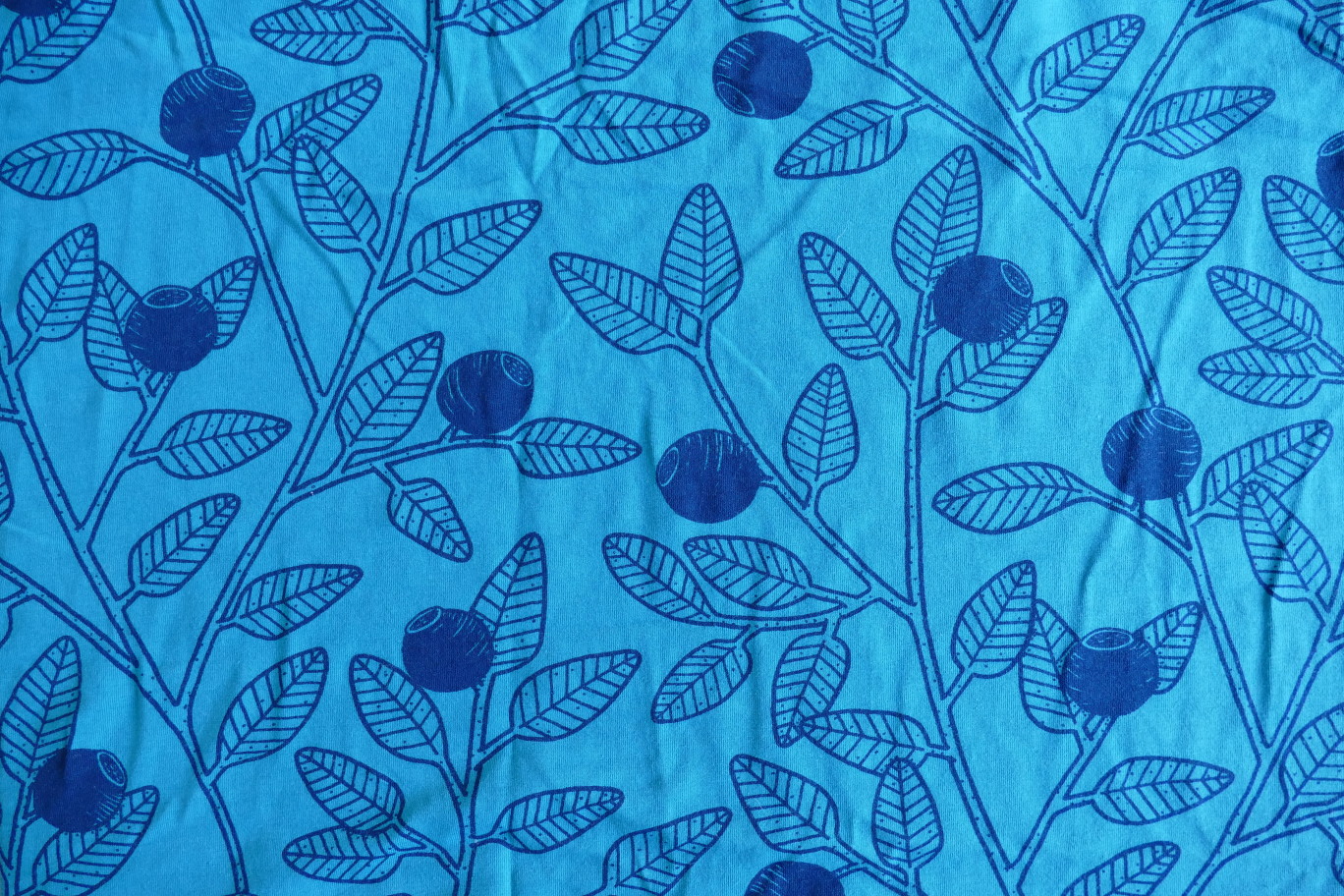 Kurz bevor ich von Wien nach Oxford aufgebrochen bin – eigentlich am letzten vollen Tag, den ich zuhause hatte – habe ich noch einen Nähkurs bei der Stoffprinzessin besucht. Ich wollte lernen, wie ich mit meiner Pfaff-Nähmaschine (ein Geschenk von meiner Großmutter), die mit mir nach Oxford übersiedelt ist, Jersey verarbeiten kann und mir T-Shirts selber nähen kann. Stoff hätte ich eigentlich schon genug gehabt, aber ein ganz besonderer Stoff hat mich bei der Stoffprinzessin angelacht: Petrolfarben und mit überdimensionalen Heidelbeerstauden darauf. Außerdem hat er einen schwedischen Namen: Blåbär. Da sind sofort alle möglichen Erinnerungen in mir hoch gekommen, von Wanderungen in Schweden und Österreich, Heidelbeer-Pflück-Pausen, blauen Händen und Lippen, Heidelbeerpalatschinken bei der lieben Oma von Freundin K. im Waldviertel, dem Heidelbeer-verrückten Hund Paxi meiner Tante in Kanada…