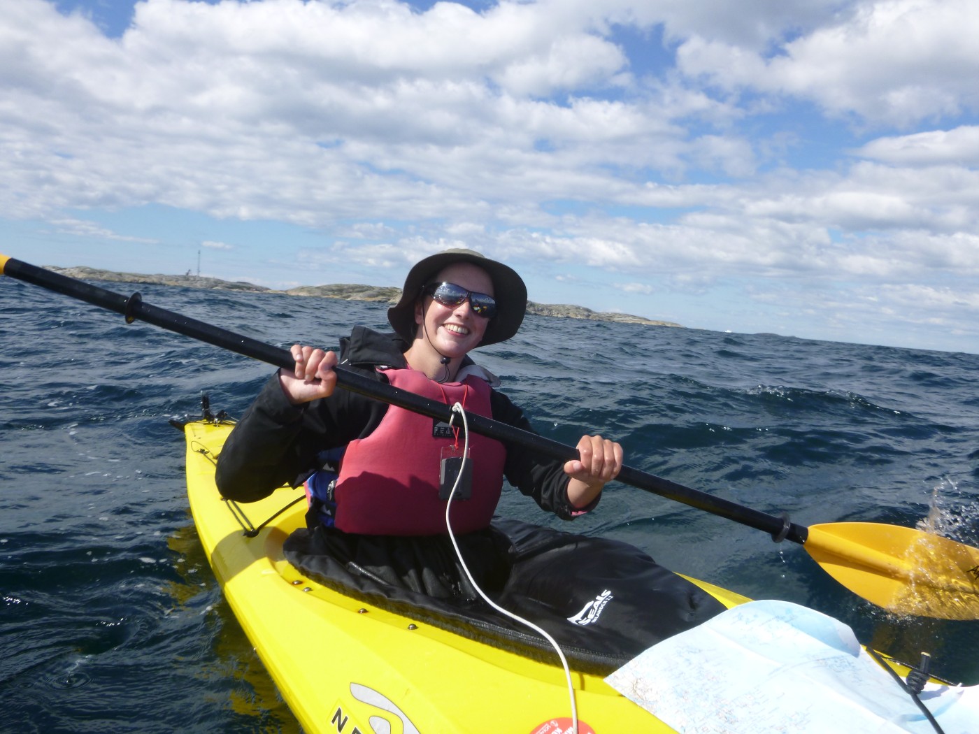 Um zu den Wetterinseln zu gelangen, galt es zunächst ein etwa fünf Kilometer langes Stück offenes Meer zu überqueren. Obwohl der Wind auch hier nicht besonders stark war, waren die Wellen deutlich bemerkbar. Die Strecke war zwar anstrengend da wir nicht gut Pausen machen konnten, aber die Orientierung war einfach: die Wetterinseln waren von Anfang an am Horizont zu sehen. Bei Sonnenschein, tiefblauem Meer und guter Laune paddelten wir unserem Ziel, der Insel Hamnerö, entgegen.