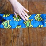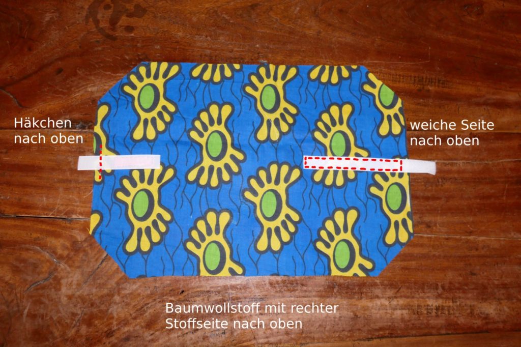 Dann näht ihr die beiden Klettbänder mit weißem Garn auf: platziert das weiche Band auf der rechten (also schönen) Seite eures Baumwollstoffes auf einer der kurzen Seiten so, dass 16 cm auf dem Stoff liegen und 4 cm überstehen, näht dabei aber nur 15 cm des Klettbandes fest (siehe Skizze). Das Band mit den Häkchen näht ihr am gegenüberliegenden Ende fest und zwar so, dass 2 cm überstehen. Näht beide Klettbänder entlang der in der Skizzen eingezeichneten Linien fest: