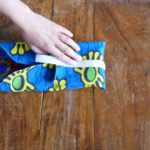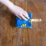 Nun könnt ihr die beiden Stofflagen miteinander verbinden. Dafür die Stoffe rechts auf rechts aufeinander legen, also mit den schönen Stoffseiten nach innen. Verwendet bei Wachstuch niemals Stecknadeln zum Fixieren, da diese Löcher im Stoff hinterlassen. Ihr könnt stattdessen kleine Klammern wie hier im Bild oder auch Wäschekluppen verwenden. Näht nun mit einem eher langen Stich (3-4) rundherum mit 1 cm Abstand zum Rand entlang, lasst dabei aber die Seite mit dem weichen Klettband offen (gestrichelte Linie im Bild).