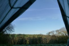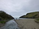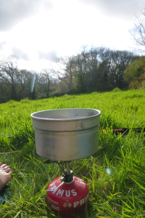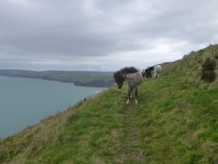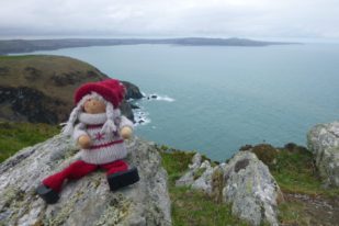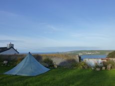 Am Morgen gleich eine nette Überraschung: ich sehe zwei Robben! Meine Schultern und die Hüfte spüren zwar den gestrigen Tag deutlich, aber das Gehen ist heute viel leichter. Es regnet nicht, der Wind hat nachgelassen und die Klippen sind nicht ganz so hoch, sodass es weniger steile Auf- und Abstieg gibt. Großartige Aussicht von Dinas Head, wo ich sowohl sehe, was ich heute schon geschafft habe, als auch was noch vor mir liegt. Viele nette Begegnungen und kurze Gespräche mit Wanderern, eine etwas merkwürdige Kellnerin in einem offenbar zu gut besuchten Lokal. Lange Mittagspause mit viel Sonnenschein, einem Jacket Potato und Bier, ein bisschen Stricken. Danach die große Müdigkeit, also gleich wieder Pause mit einem Nickerchen am Strand. Heute möchte ich wild zelten, also zweige ich etwas vom Coast Path ab und suche in einem Wäldchen nach einer geeigneten Stelle. Auf dem Weg dorthin sehe ich einen Fuchs. Auf einer kleinen recht versteckten Wiese schlage ich mein Lager auf, lasse meine Füße in der Abendsonne lüften und erzähle Martin stolz, dass ich heute nicht auf einem Campingplatz nächtigen werde. Die Nacht verläuft angenehm unspektakulär, es wird zwar wieder eher kalt, aber ungebetene Gäste, beängstigende Geräusche oder Albträume bleiben mir erspart.
