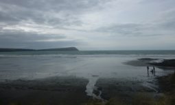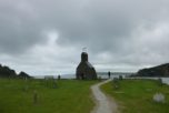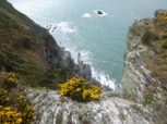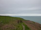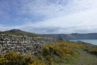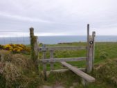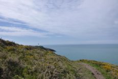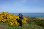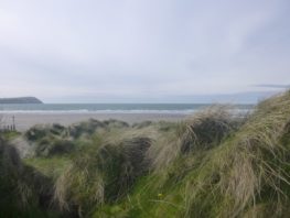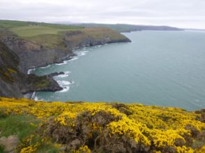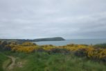 Der Himmel ist über Nacht zugezogen und als ich losgehe, beginnt es leicht zu regnen. Nach dem Campingplatz komme ich direkt an die Küste und der Wind frischt auf. Der Weg ist recht ausgesetzt und der starke Wind macht das Gehen mit schwerem Rucksack zu einer Herausforderung. Zum Glück habe ich meine Wanderstöcke als Stützen dabei! Der Wind begleitet mich den ganzen Tag über und es regnet immer wieder – das entspricht aber auch ziemlich meinen Erwartungen vom Wetter in Wales. Die Küste ist dennoch beeindruckend schön, und fast menschenleer. In der Nähe des Weges einen Zeltplatz zu finden, wird wohl schwierig: rechts von mir geht steil zum Meer hinab, links von mir begrenzen Zäune Tierweiden und auf dem schmalen Streifen dazwischen bin ich von Ginterbüschen umgeben. Diese blühen gelb und verströmen einen süßlichen Kokos-Duft, sind aber leider sehr stachelig. Mittagsrast mit warmen Essen in einer windgeschüzten Mulde gibt mir Kraft und so erreiche ich trotz Wind und Wetter am Nachmittag Newport Sands. So weit wollte ich am ersten Tag eigentlich gar nicht gehen. Zur Belohnung kommt auch die Sonne wieder hervor. Ich beschließe noch bis in die Stadt hineinzuwandern und dort, nach 22 km, am Campingplatz mein Zelt aufzuschlagen. Es war ein ganz schön anstrengender erster Tag, aber ich bin sehr zufrieden mit dem, was ich geleistet habe.
