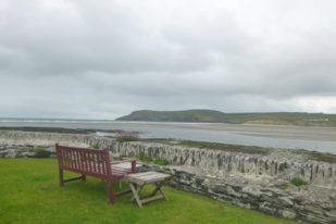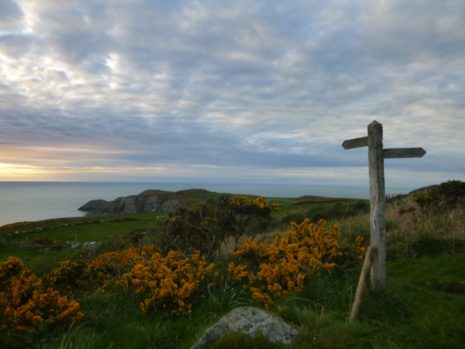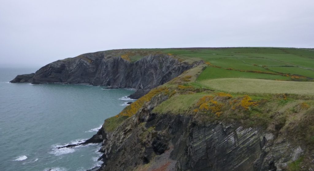Ich werde von strahlendem Sonnenschein begrüßt, ein herrlicher Morgen! „Meine“ Wiese liegt allerdings noch im Schatten, es ist alles nass vom Tau und recht frisch. Ich beeile mich mit dem Aufbrechen und mache mich auf den Weg in die Stadt Fishguard. Unterwegs ein kleiner, charakteristisch duftender, Bärlauch-Wald. Den Bärlauch lasse ich aber stehen, da ich nicht so recht weiß zu welchem meiner selbst vorbereiteten Fertiggerichte er gut dazu passen könnte. Das gute Wetter hält den ganzen Tag und ich bekomme viel Sonne ab. Wer hätte denn das gedacht? Die Klippen hier sind etwas rundlicher als bisher, da es sich um härteres Vulkangestein handelt. Die Wege sind dadurch recht leicht zu begehen, aber dennoch fühlt sich das Wandern heute recht anstrengend an. Mein Körper ist müde, vor allem die Füße und die Schultern, und umso mehr freue ich mich als ich am Nachmittag die Jugendherberge in Pwell Deri erreiche. Unglaubliche Aussicht aufs Meer, tolle Menschen, die meine Leidenschaft fürs Wandern teilen, warme Dusche, wunderschöner Sonnenuntergang, gemütliches Lesen in der „Lounge“.