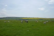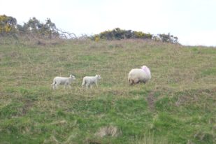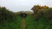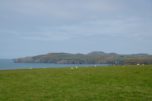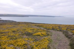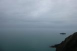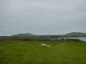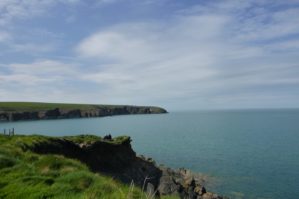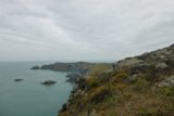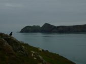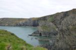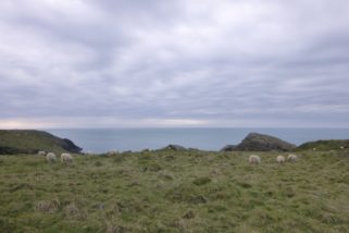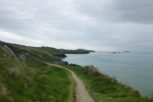 Ein gemütlicher Wandertag, denn ich habe heute nicht vor besonders weit zu gehen. Der Tag beginnt ganz ruhig – das Meer und der Himmel haben dieselbe graue Farbe, ich treffe unterwegs weder Menschen noch Tiere. Doch dann zwei Tiererlebnisse unterschiedlicher Art. Zuerst das positive: Bei St. Davids Head sehe ich zwei Schweinswale (engl.: porpoises)! Sie schwimmen nebeneinander her und immer wieder sieht man ihre schwarzen Rückenflossen aus dem Wasser tauchen.