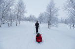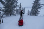 Einen essentiellen Ausrüstungsgegenstand haben wir uns speziell für diese Wintertour zugelegt: unsere Pulka, ein Gepäcksschlitten, den man beim Skifahren hinter sich herziehen kann. Wir hatten vor vier Jahren, als wir einen Winter-Survival-Kurs beim STF besucht haben, zum ersten Mal eine Pulka verwendet und waren ganz begeistert davon, wieviel leichter es ist damit Lasten zu transportieren als in einem Rucksack. Unsere Pulka haben wir zu Mimis Cousine nach Schweden bestellt und waren ganz aufgeregt, als wir sie aus dem großen Paket rausgeholt haben! Schön ist sie, fröhlich rot, geräumig, aber im Vergleich zu den traditionellen Holzpulkas relativ leicht. Etwas entsetzt waren wir als wir sie komplett beladen zum ersten Mal abgewogen haben: stolze 45 kg brachte das dick beladene Ding auf die Waage! Wir waren beim Packen vielleicht doch etwas zu großzügig und haben ein paar Mal zu oft gedacht „Mit der Pulka geht das alles viel leichter, da können wir dieses eine Ding auch noch mitnehmen.“ In der Hoffnung, dass sich die 45 kg im Schnee bewältigen lassen, sind wir dann mit vollem Gepäck losgefahren.