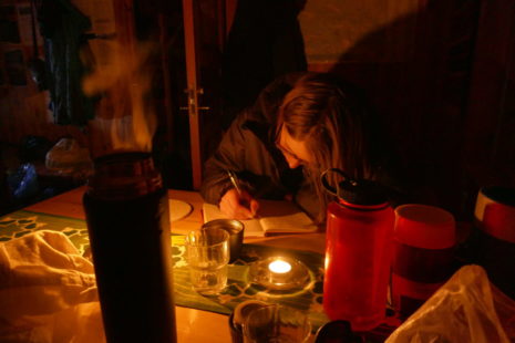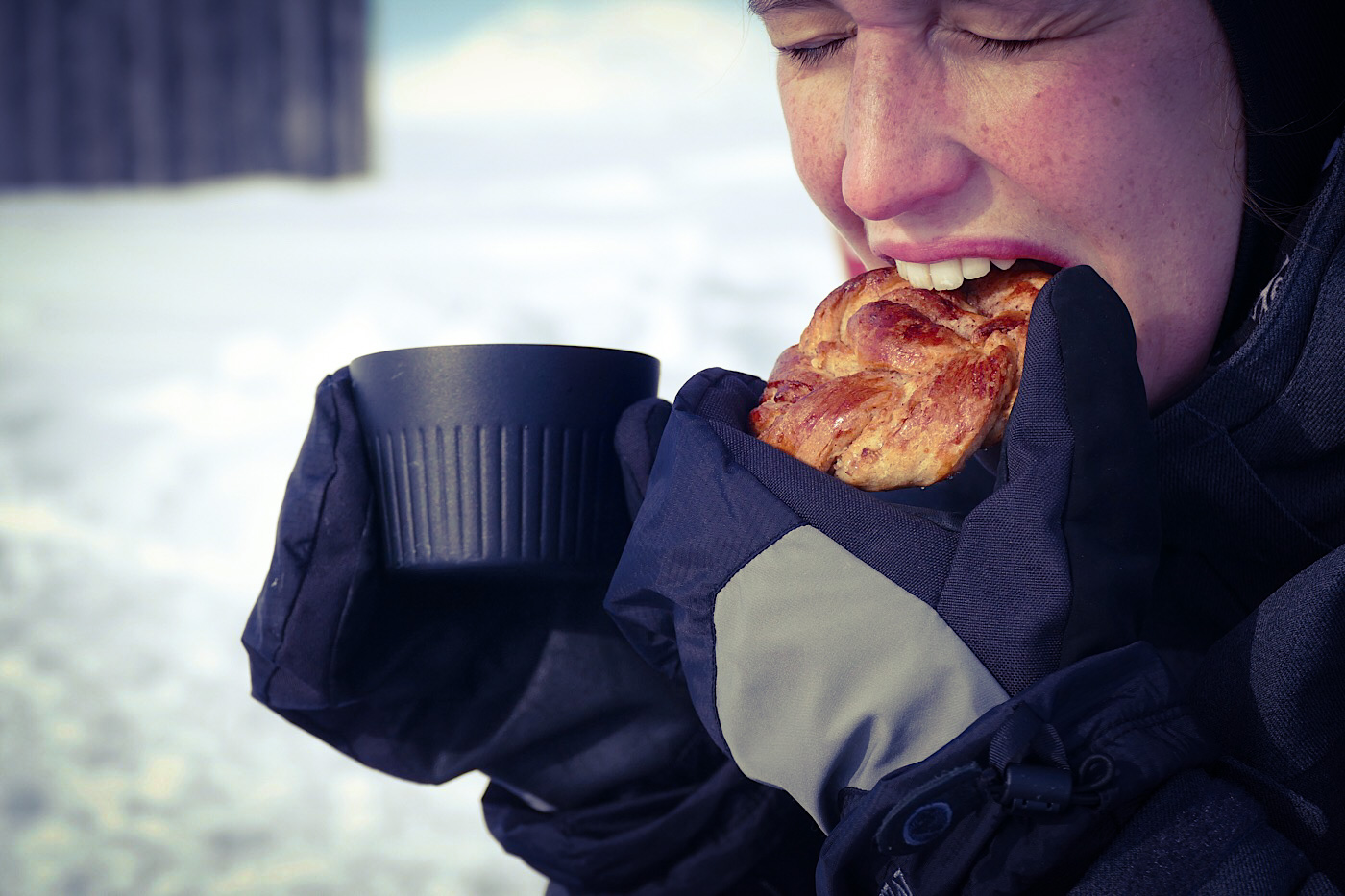 Wenn bis Ende April noch tiefster Winter ist, Seen und Flüsse so dick zugefroren sind, dass man sie mit Schneemobilen überqueren kann, dann ist es doch sicher schrecklich kalt? Wie kann man da auch nur daran denken den ganzen Tag draußen zu verbringen und dann auch noch im Zelt zu schlafen? Tatsächlich empfinden wir die Kälte hier in den unterschiedlichsten Situationen ganz unterschiedlich: wenn man in Bewegung ist, ist einem sehr schnell warm und wenn man auch noch die Pulka zieht, wird einem richtig heiß, wenn die Sonne scheint, fühlen sich auch -10 Grad frühlingshaft warm an, wenn man in die Daunenjacke oder den dicken Schlafsack gekuschelt ist, ist es wohlig warm, wenn man unterwegs warmen Tee trinkt, breitet sich die Wärme angenehm im ganzen Körper aus, wenn man allerdings stehen bleibt und der Wind pfeift, dann wird einem schnell kalt, wenn man nach einer Zeltnacht in die kalten Schuhe schlüpft, fühlen sich die Zehen wie Eisklumpen an, wenn sich in den Wasserflaschen Eiskristalle bilden und die Verschlüsse zufrieren, dann wird einem bewusst, dass es doch recht kalt ist. Aber irgendein Mittel gegen die Kälte haben wir immer parat – und das beste ist ein Saunagang am Ende des Tages!