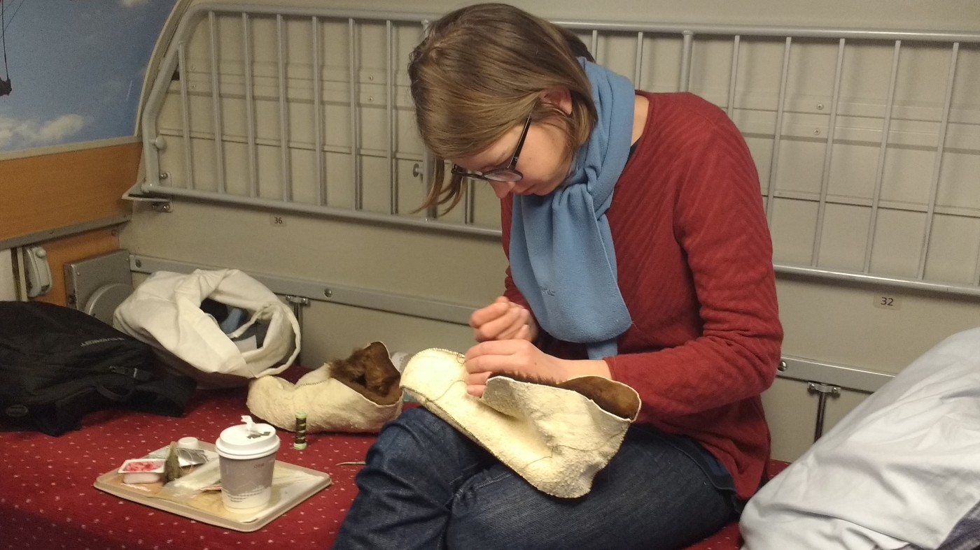 Coolster Ausrüstungsgegenstand (Martin): Meine Lammfellschuhe für Zelt und Hütte sind bei mir ganz klar der beste Ausrüstungsgegenstand. Die halten die Füße herrlich warm und sind – selbstverständlich – Mimi-made. Auf dem Foto sieht man die letzten Herstellungsschritte während unserer Zugfahrt in den Norden.