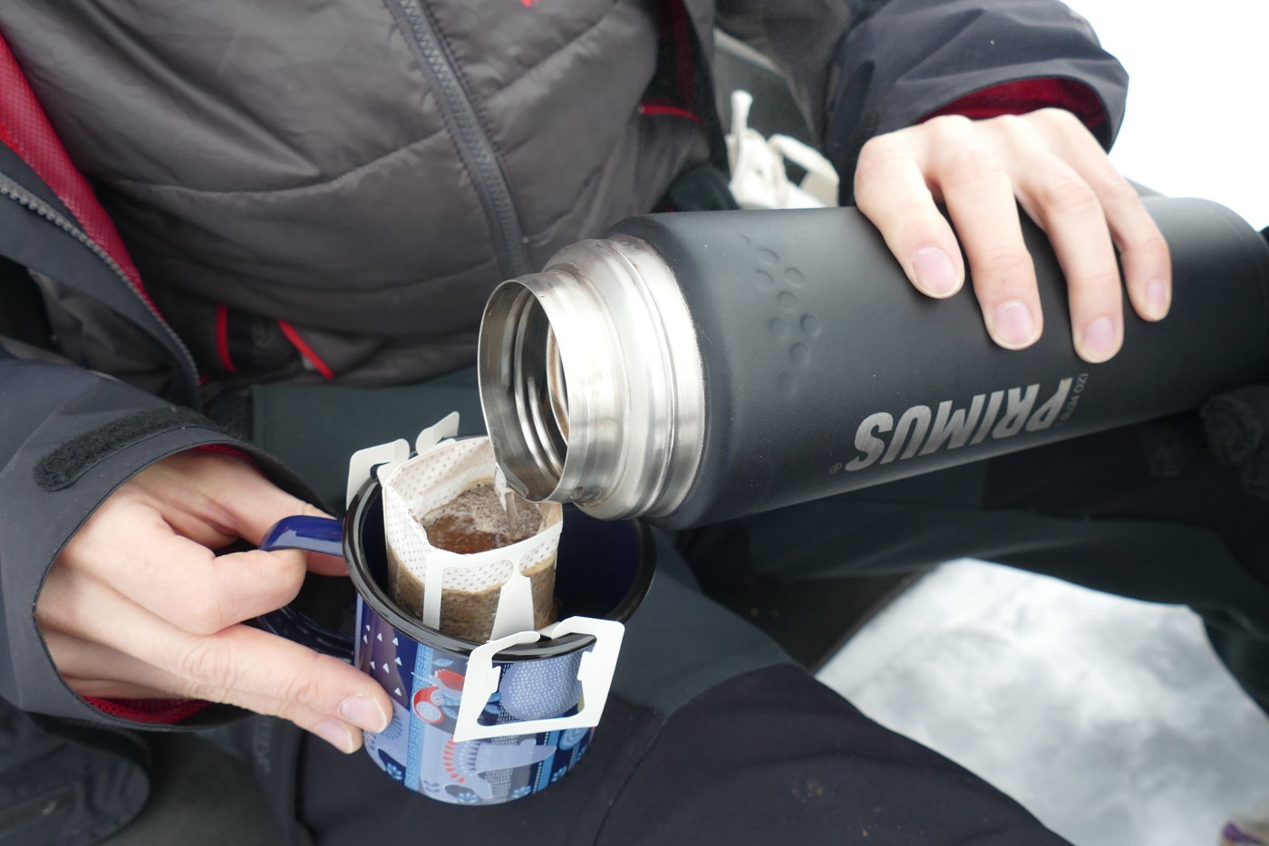 Bester Kaffee: Ein Geschenk vom Freund von Martins Schwester: feinster Filter-Kaffee für unterwegs, zubereitet während einer sonnigen Mittagspause. Ansonsten musste Instant-Kaffee genügen.