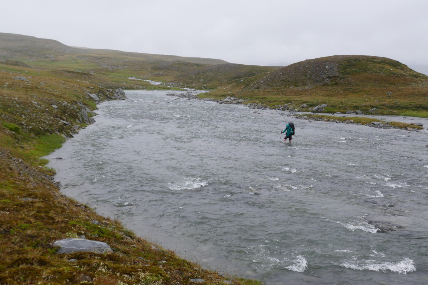 Wir haben soeben den Nijakjågåsj-Fluss überquert und sind froh heil am anderen Ufer angekommen zu sein. Das Wasser war eiskalt und das Furten durchaus anspruchsvoll: Der Fluss führt trübes ca. 5 Grad kaltes Gletschwerwasser, sodass man nicht auf den Grund sehen kann. Langsam müssen wir uns mithilfe unserer Wanderstöcke vorantasten, es ist nicht einfach einen geeigneten Weg zu finden und wir kämpfen gegen die teils starke Strömung an. Während dem Furten hat es auch wieder begonnen stark zu regnen und es sind nun nicht nur unsere Füsse zu Eiszapfen gefroren, sondern auch unsere Finger ganz klamm. Zitternd ziehen wir uns die „Wat-Schuhe“ aus und schlüpfen wieder in Wanderschuhe, die zwar auch nass, aber immer noch wärmer sind. Unsere Füße brennen richtig vor Kälte und wir können nicht konzentriert denken, aber wir müssen uns nun entscheiden. Gehen wir nach links weiter, weiter hinein nach Sarek und folgen unserem Plan, oder biegen wir nach rechts ab und gehen in Richtung Kisuris-Hütte? Gestern hat uns eine schwierige Furt herausgefordert und es hat bei unbarmherzigen Schüttregen und Sturm einige Stunden im Schutz unseres Zeltes gedauert, bis sich unsere Füße wieder einigermaßen warm angefühlt haben. Wenn das Wetter so schwierig bleibt, können wir dann die nächsten 5-6 Tage durchhalten? Wir lassen unsere Füße, die sich nach Trockenheit und Wärme sehnen, entscheiden und biegen nach rechts ab.