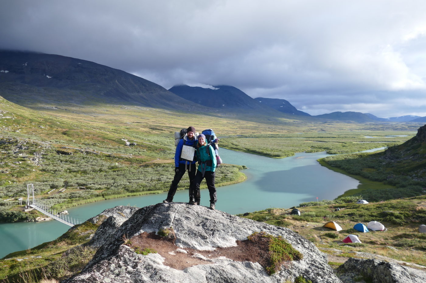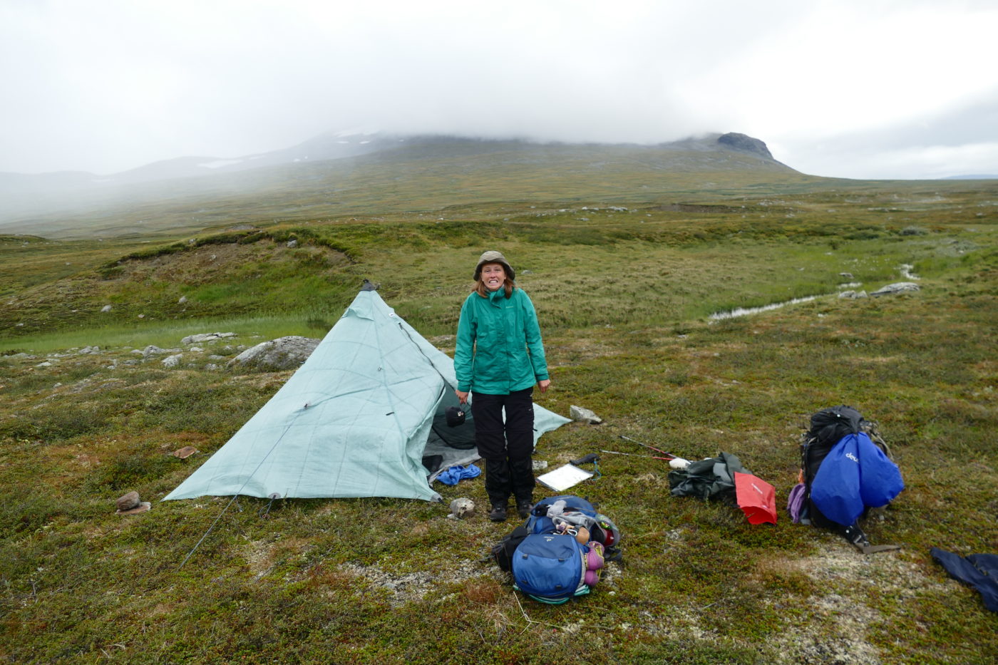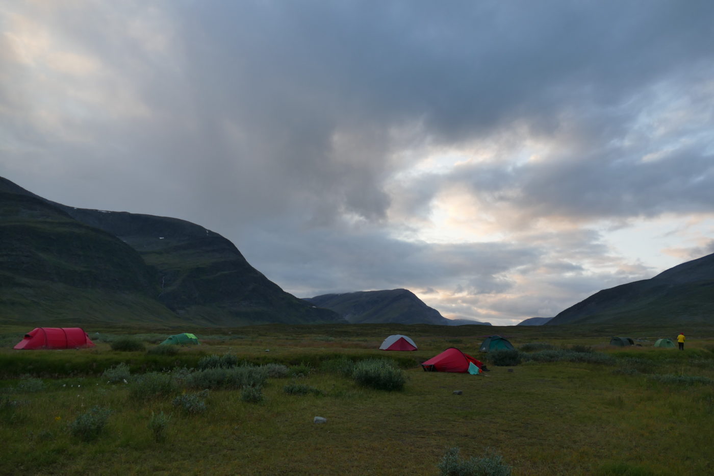 Auf dieser zwei Wochen und insgesamt 287 km langen Etappe haben wir gut ausgebaute und stark frequentierte Wanderwege, aber auch einsame Pfade und Querfeldeinabschnitte erlebt. Wir haben viel gezeltet und ab und zu in STF-Hütten sowie in Hütten der Samischen Touristenorganisation übernachtet. Inzwischen wirkt es so als würde sich der Sommer langsam einem Ende zuneigen: es hat deutlich abgekühlt (Tagestemperaturen um die 5-10 Grad) und wir haben einiges an Regen abbekommen, auf den Berggipfeln gibt es nun schon ersten Neuschnee (ab ca. 1400m) und die Blätter beginnen sich schon zu verfärben… Übrigens, auf unseren Fotos ist das Regenwetter meist etwas unterrepräsentiert – das liegt schlicht und einfach daran, dass wir unserer Kamera nicht allzu viel Regen zumuten wollen!
