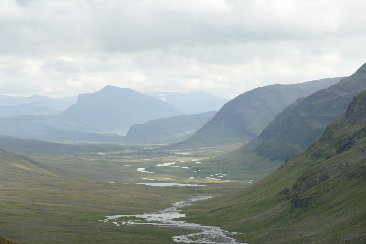 Als wir nach 3,5 Tagen den Kungsleden verlassen und in ein Seitental abbiegen, sind wir mit einem Schlag wieder alleine unterwegs. Auf dem restlichen Weg bis Ritsem sind wir oft stundenlang alleine unterwegs. Auch wenn uns der populäre Kungsleden gut gefallen hat, sind wir nun froh die Natur wieder in Stille genießen zu können.