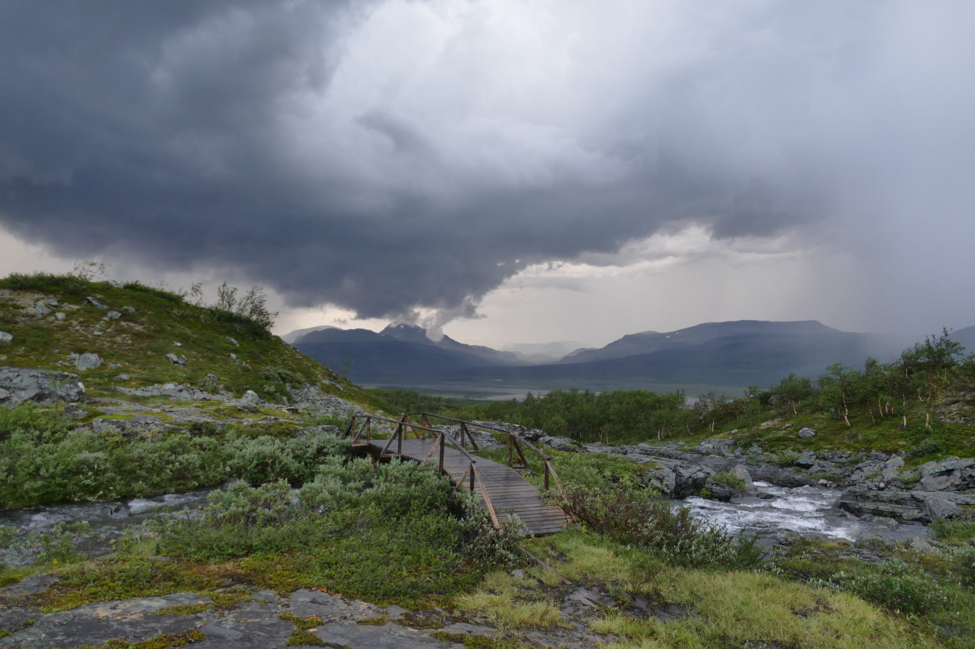 Am nächsten Morgen streikt Mimis Kreislauf. Das heiße, schwüle Wetter, die gestrige Anstrengung und eine unruhige, kurze Nacht waren offenbar zu viel. Nach einem knappen Wanderkilometer, der sich so anstrengend wie nie zuvor anfühlt, machen wir Rast und Mimi schläft sofort ein. Eine lange Pause ist offensichtlich notwendig, denn die nächsten Stunden schläft Mimi wie ein Stein. Wir brechen erst am späten Nachmittag wieder auf um einen Zeltplatz für die Nacht zu finden – an unserem momentanen Rastplatz gibt es nämlich kein Trinkwasser. Wir gehen noch einen Kilometer und bauen unser Zelt neben einem Bach in einer kleinen Senke auf, gut geschützt, denn Gewitterwolken beginnen aufzuziehen. Tatsächlich bricht bald darauf ein Unwetter über uns herein, es donnert, blitzt, stürmt, schüttet, hagelt und der Wind reißt an unserem Zelt. Wir sind froh an einer gut geschützten Stelle und in einem perfekt wasserdichten Tarp zu sein, aber unheimlich ist es trotzdem diese Naturgewalten aus nächster Nähe zu erleben. Das Gewitter bringt den ersehnten Wetterumschwung: es ist nachher um 20 Grad kühler und Mimis Kreislauf erholt sich schnell wieder. Am nächsten Morgen sind wir wieder frisch und munter, die Wanderung nach Abisko kann nun so richtig beginnen.
