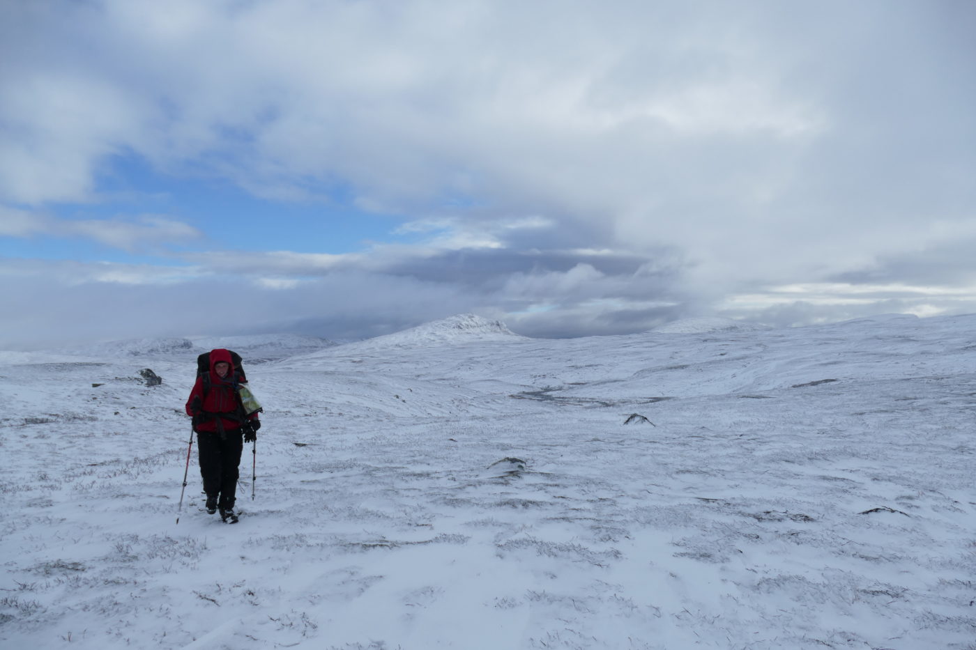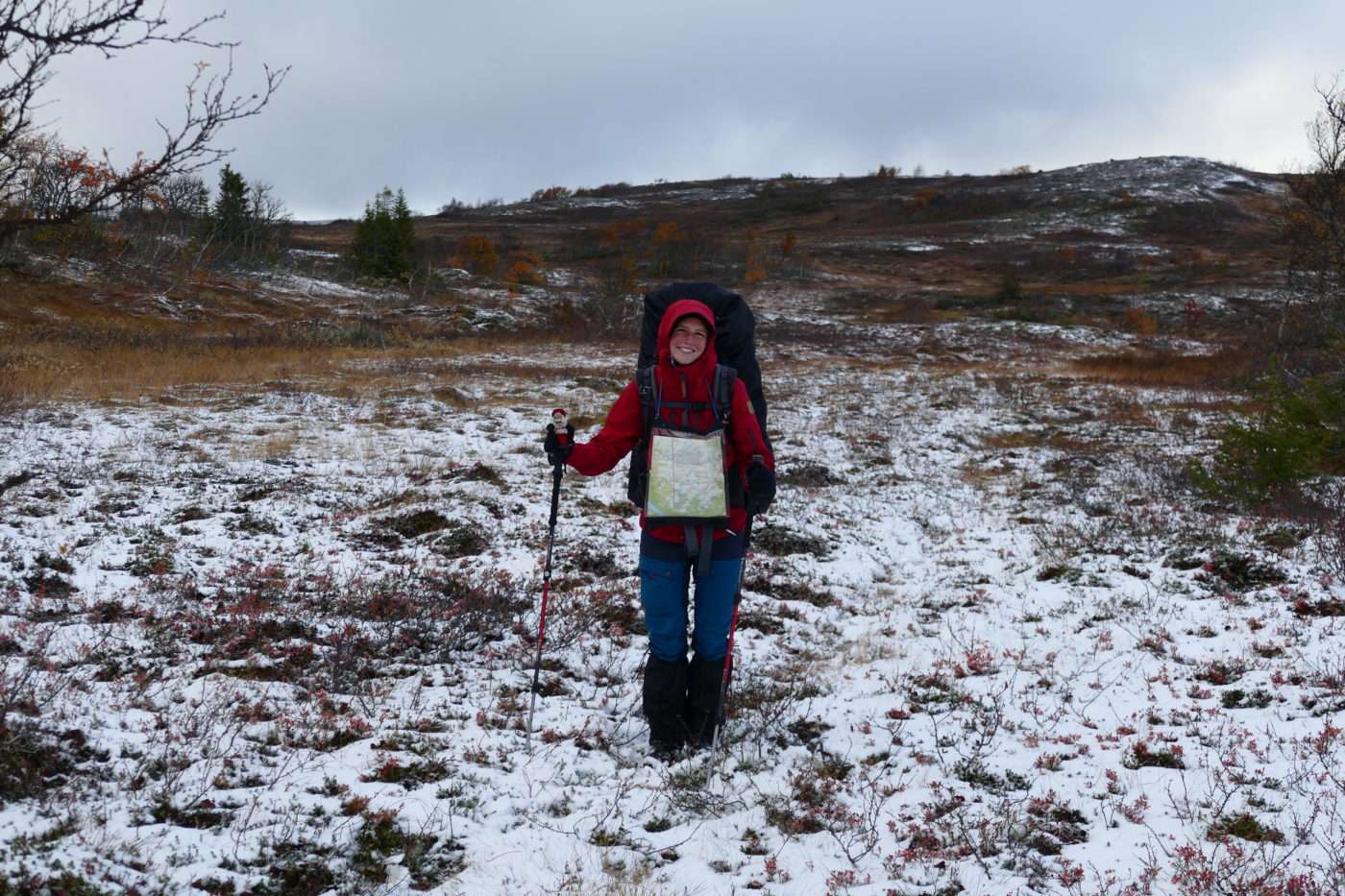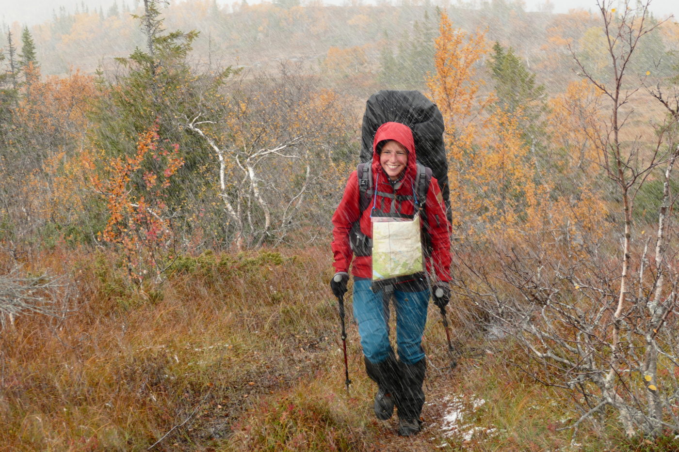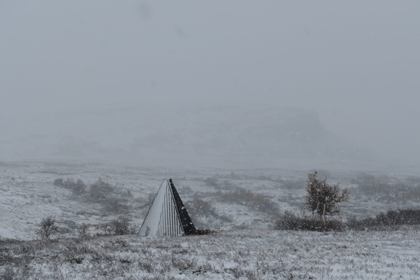 Das Wetter ist härter geworden: kräftiger Wind und starker Niederschlag, der abwechselnd als Regen und Schnee vom Himmel fällt. Wir folgen in etwa der norwegisch-schwedischen Grenze, die alle paar Kilometer von riksrös – Grenzmarkierungen in Form von geschlichteten Steinhaufen – angezeigt wird. Die älteren davon stammen aus dem 18. Jahrhundert. Wir fragen uns, wer wohl die Leute waren, die diese Steine gesammelt und geschleppt haben – und ob sie auch mit schwierigem Wetter zu kämpfen hatten.