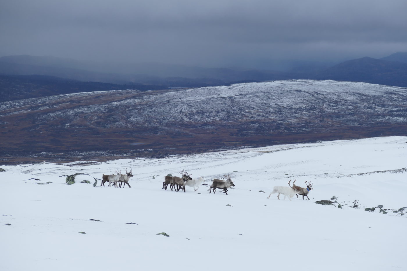 Als wir den höchsten Punkt der heutigen Wanderung erreicht haben, bietet sich uns ein beruhigender Anblick. Wir sehen nicht nur das schneefreie Tal, sondern auch eine Herde Rentiere. Dass auch unsere treuesten Wanderbegleiter hier oben am Berg sind, gibt der Situation eine gewisse Normalität.