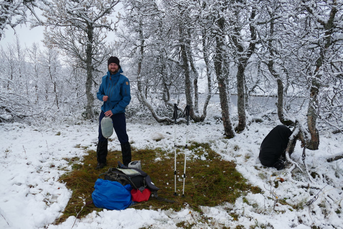 Mit vollen Bäuchen und der Gewissheit den Lierne Nationalpark erfolgreich durchquert zu haben, schlafen wir ausgezeichnet. Über Nacht schneit es wieder und unser Zelt ist in der Früh schneebedeckt. Die Einladung der Jäger mit ihnen in der warmen Hütte zu frühstücken nehmen wir sehr gerne an. So fängt Martins Geburtstag gut an!