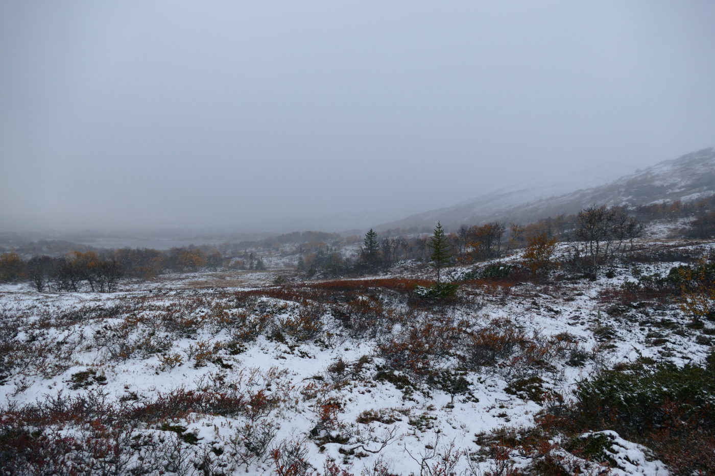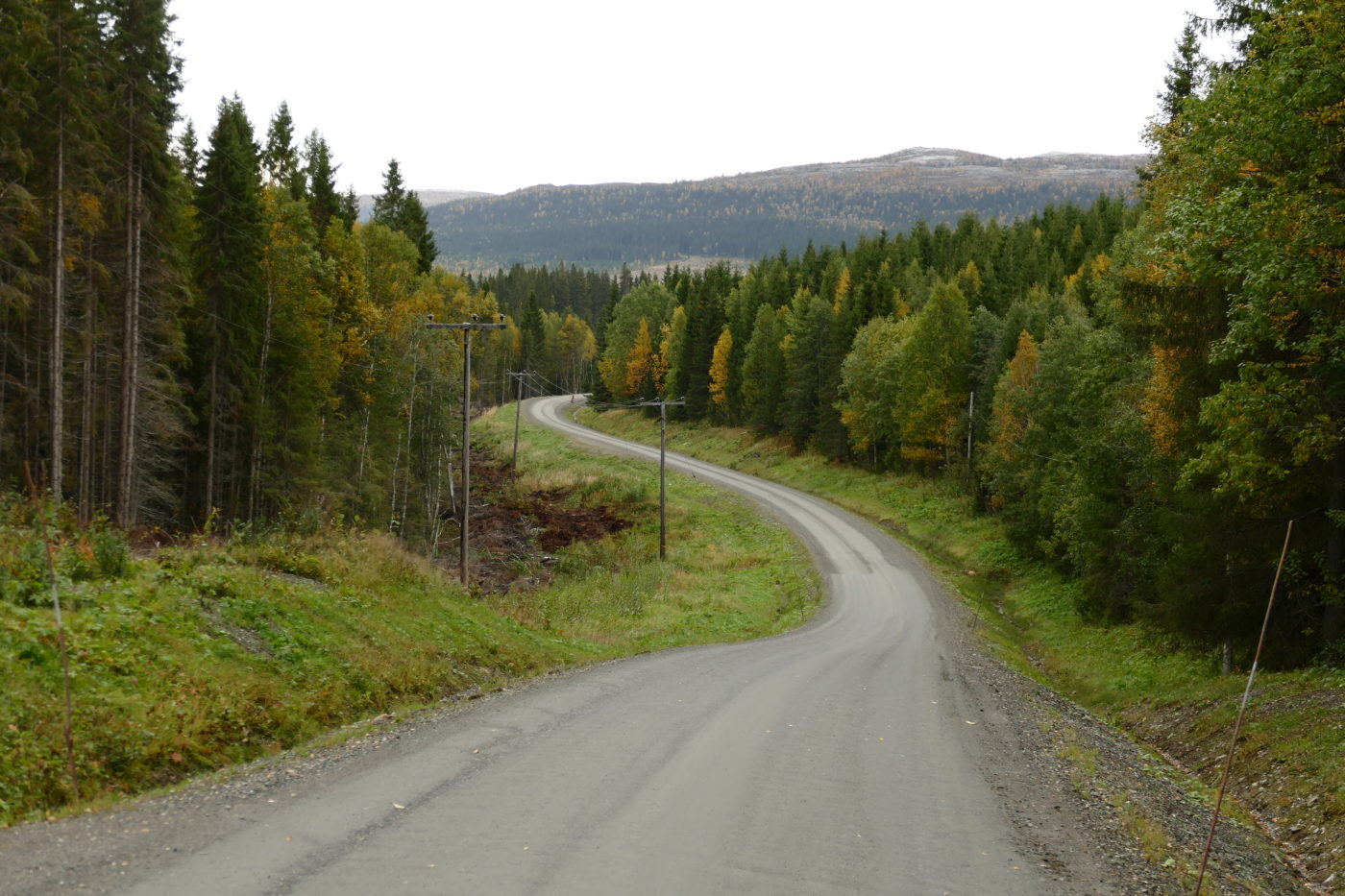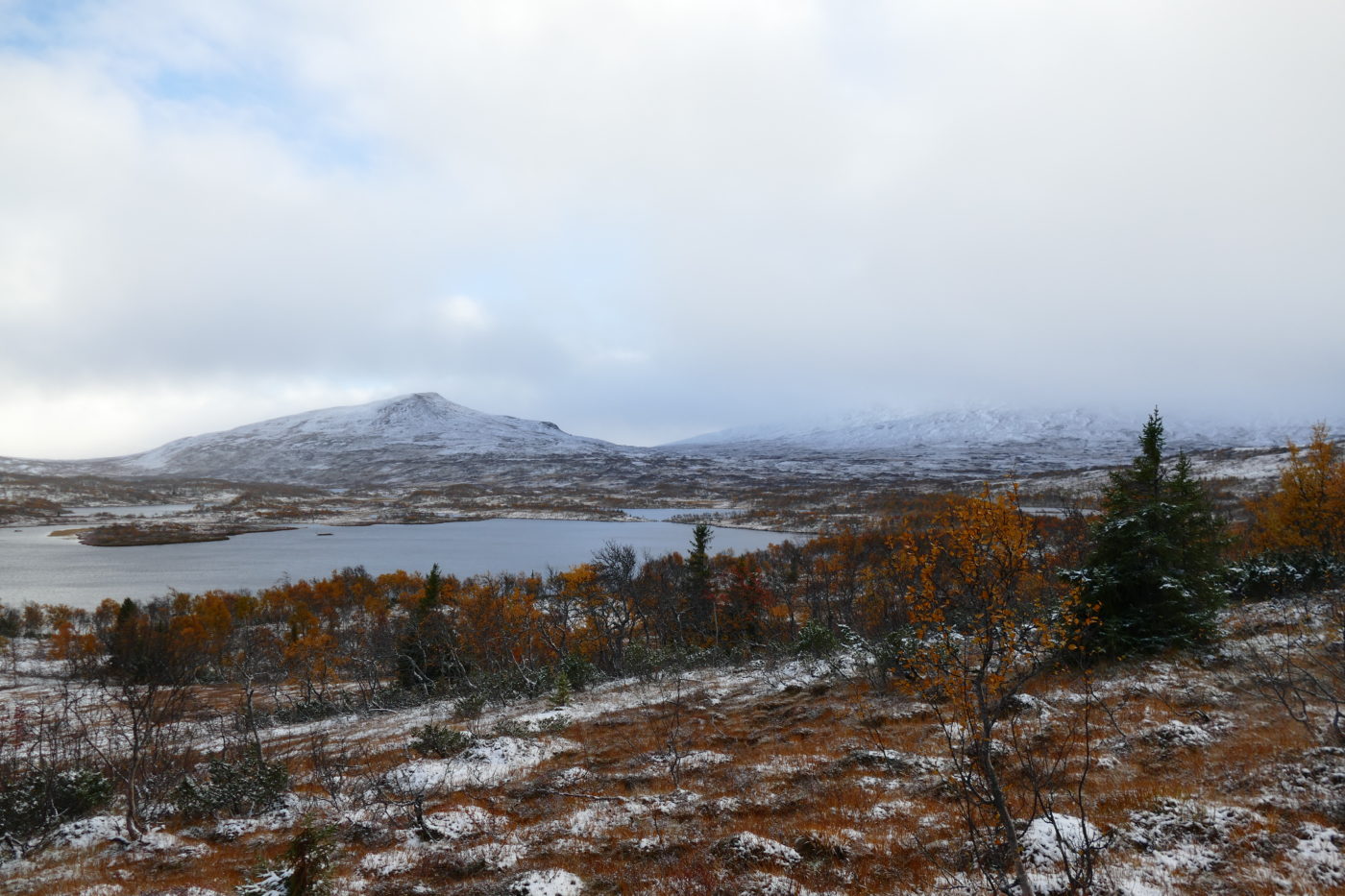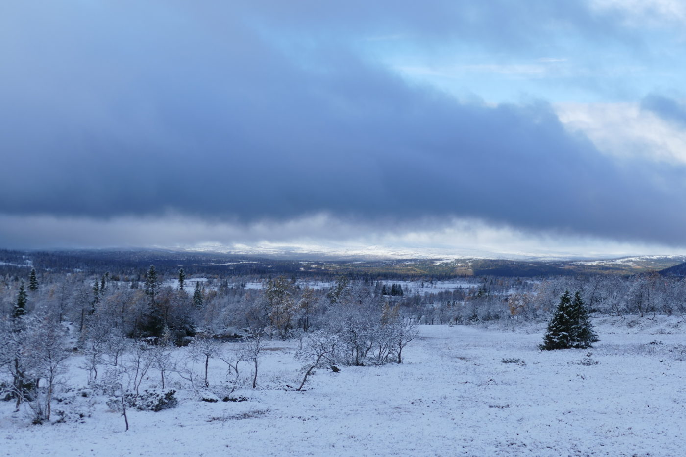 Als wir Gäddede verlassen, tanzen einzelne Schneeflocken vom Himmel. Weiter oben in den Bergen hat es über Nacht geschneit, wenn auch nicht viel. Wir freuen uns über den Schnee, denn Regen hatten wir in letzter Zeit genug. Besonders Mimi ist ganz verzückt über den ersten Schnee in diesem Jahr. Wir folgen zuerst einer Asphaltstraße, dann einer Schotterstraße bis wir auf einem Forstweg bergauf Richtung Lierne Nationalpark, einer weitläufigen und einsamen Bergregion, abbiegen. (Streng genommen heißt das Gebiet nur in Norwegen Lierne und in Schweden Hotagen Naturreservat, aber diese Feinheit ignorieren wir einfach.)