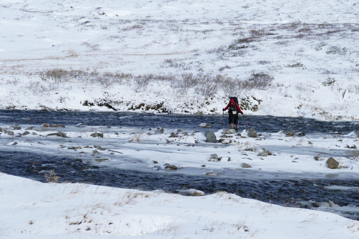 Mit unserem neuen Plan ersparen wir uns die Furt über den Avansbäcken, der wegen dem starken Niederschlag der letzten Tage immer noch sehr viel Wasser führt. Zwei Zuflüsse müssen wir aber dennoch queren. Bei den eisigen Temperaturen aus den Wanderschuhen und in unsere Flussüberquerungsschuhe zu schlüpfen, in das brennend kalte Wasser zu steigen und uns einen Weg zum anderen Ufer zu suchen, kostet Einiges an Überwindung.