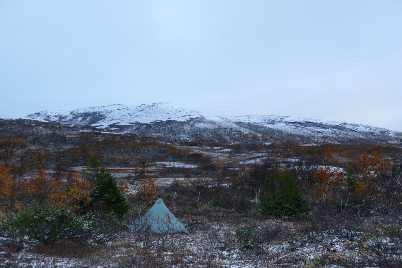 Wir gehen ohne längere Pausen, denn der nasse Schnee und Wind kühlt uns schnell aus. Dabei kommen wir ganz gut voran, die Orientierung an Bergrücken und Seen gelingt uns trotz mäßiger Sicht problemlos. Für eine Mittagspause steuern wir eine Rentierzüchter-Hütte an, um in deren Windschutz unser Tarp aufzubauen und Mittagessen zu kochen.