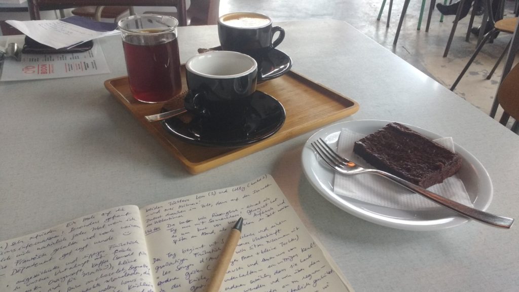 Mindestens so wichtig wie das Vorankommen ist auch das Pausenmachen. Sich Zeit nehmen um über das Erlebte nachzudenken und zu reden. Tagebuch schreiben. Entspannen. Eine gute Tasse Kaffee genießen. An den köstlichen Kaffee im Society Café in Oxford ist unterwegs kein anderer Kaffee rangekommen, aber wir haben doch immer wieder sehr nette Cafés mit ausgezeichnetem Kaffee gefunden. Das Bild stammt aus einem Café in Ghent, in dem zu unserer Überraschung auch Almdudler serviert wurde. Eigentlich wollten wir dort nur kurz einkehren um dem Regen zu entkommen, da der Regen dann aber nicht aufhören wollte, sind wir gleich mehrere Stunden sitzen geblieben und haben uns sehr wohl gefühlt.