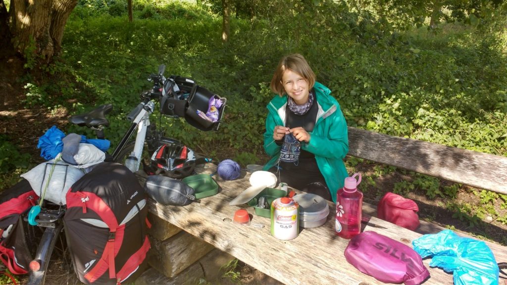 Während unserer Zeit in Oxford habe ich, Mimi, das Stricken wieder für mich entdeckt und bin mittlerweile ziemlich strick-besessen. Es war also klar, dass auch Strickzeug in meine Radtaschen gepackt werden musste! Unterwegs sind zwei Hauben entstanden – eine für mich, eine für Martin – und ich habe an einem Weihnachtsgeschenk gearbeitet – blau-weiße Fäustlinge mit nordischem Muster. In den Pausen am Wegesrand und abends im Zelt (mit Stirnlampe) stricken zu können, war eine tolle Entspannung und hat viel Spaß gemacht!