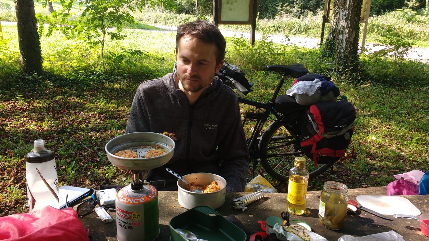 Was wir am Zelt-Leben und am Unterwegs-Sein besonders mögen, ist das Kochen am Campingkocher. Bei unseren ersten gemeinsamen Wanderungen hatten wir uns noch vorwiegend von Packerlnudeln und -Suppen ernährt, diese sind aber weder besonders gesund noch abwechslungsreich. So haben wir mit der Zeit verschiedenste Rezepte ausprobiert und haben nun eine ganze Sammlung an wohlschmeckenden, gesunden Unterwegs-Rezepten. Bei diesem Mittagessen haben wir es uns besonders gut gehen lassen und haben vegetarische Burger gebraten. Besonders oft haben wir während dieser Tour „Risotto a la Paul“ gekocht, ein Pilzrisotto, das nach einem lieben Oxforder Freund benannt ist, der uns immer zu herrlichen Abendessen eingeladen hat.