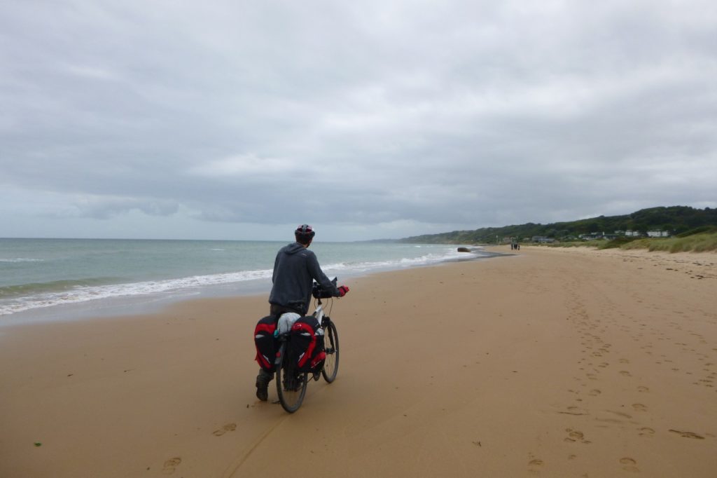 Wenn man sich unsere Radroute auf einer Karte ansieht, wird man schnell merken, dass wir nicht gerade den kürzesten Weg von Oxford nach Wien gewählt haben. Ein Grund dafür ist, dass Mimi Martin die Normandie zeigen wollte – eine Gegend in der sie schon vor einigen Jahren mit ihren Eltern unterwegs war. Vom Wetter her hat sich die Normandie nicht gerade von ihrer schönsten Seite gezeigt und hat uns ordentlich herausgefordert, dennoch hat uns dieser Streckenabschnitt sehr gut gefallen. Die Sandstrände, die steilen Klippen, die hübschen Fachwerkhäuser, die hügeligen Felder und Weiden, die Omnipräsenz der Geschichte, der weite Blick aufs Meer… Direkt am Strand hat der Weg übrigens nie entlang geführt – das Bild ist entstanden, als wir bei Omaha Beach versucht haben eine Abkürzung zu nehmen. Abkürzung war’s keine, aber lustig war’s trotzdem!