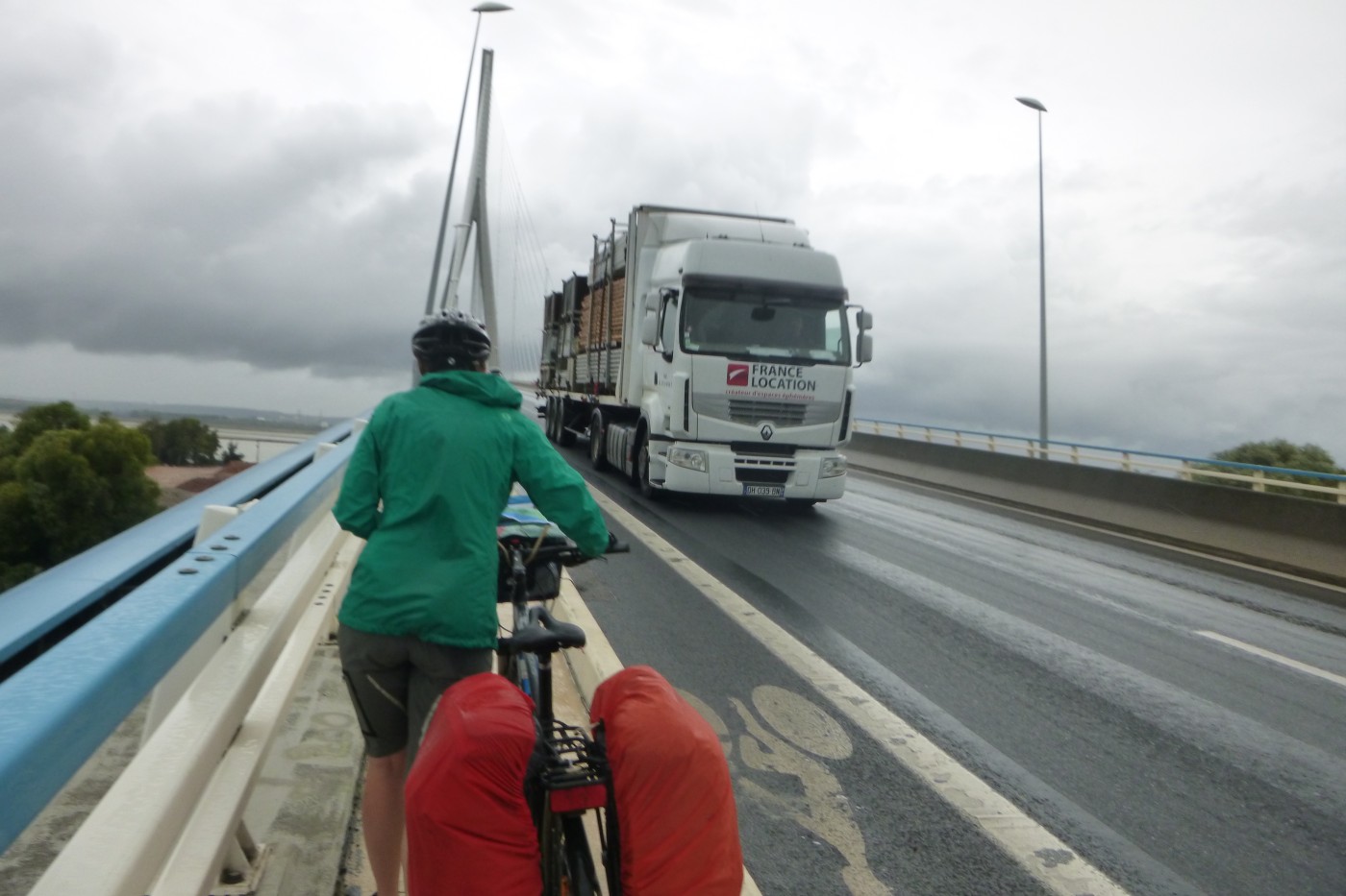 Ein nicht gerade positives, aber sehr einprägsames Erlebnis war die Überquerung des Pont de Normandie auf dem Weg von Honfleur nach Le Havre. Honfleur war einer der Orte, den Mimi von ihrem Besuch mit ihren Eltern in besonders positiver Erinnerung hatte – mit seinem alten Hafenbecken, der norwegisch anmutenden Holzkirche und den vielen Restaurants, bei denen man draußen sitzen kann und eine Salade au chèvre und ein Glas Cidre genießen kann… Für uns war das Honfleur-Erlebnis leider vom Regen, eher kühlen Temperaturen und einem vorrübergehenden Energietief etwas getrübt. Energie haben wir nach Honfleur aber noch gebraucht, wir wollten ja noch die mehr als 2 km lange Brücke, die sich über die Mündung der Seine spannt, überqueren. Wir hatten uns vorher noch im Tourismusbüro erkundigt und zugesichert bekommen, dass die Brücke auch per Fahrrad befahren werden darf, mussten dann aber bald einsehen, dass dies keine so besonders gute Idee ist. Der Radstreifen (auf dem Bild rechts neben Mimi) war ein schmaler, von der restlichen Fahrbahn nur optisch getrennter Streifen. Abgesehen davon, dass die Autobahn, die über die Brücke führt, sehr stark befahren ist und wir permanent von LKWs überholt worden wären, ging auch ein ordentlicher Wind, der es gar nicht so einfach machte den Lenker stabil zu halten… Wir entschieden uns also für Schieben – auf dem Fußgängerstreifen, der etwas geschützter ist. Das war ganz schön anstrengend, immerhin liegt die Brücke am höchsten Punkt über 50 Meter über dem Wasserniveau! Als wir ziemlich geschafft am anderen Ufer angekommen sind, ist die Radroute Eurvélo 5 leider nicht viel fahrradfreundlicher weitergegangen… Der Weg führte uns nämlich (ohne Radstreifen, in Begleitung einiger LKWs) auf einer Schnellstraße durch das Hafengebiet von Le Havre. Das war eindeutig der Streckenabschnitt auf unserer Tour, der am wenigsten Spaß gemacht hat – und vermutlich auch der gefährlichste. Letzten Endes ist der Tag aber sehr gut zu Ende gegangen, da wir das Glück hatten, in der Stadt ein großartiges, preiswertes Hotel zu finden, in dem wir unseren Hunger stillen, uns duschen und ausruhen konnten. So wird Le Havre doch noch in positiver Erinnerung bleiben!