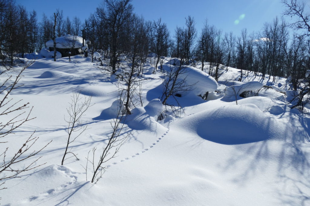 - Take the „tillfälligt led“ that leads from the hut to a winter path